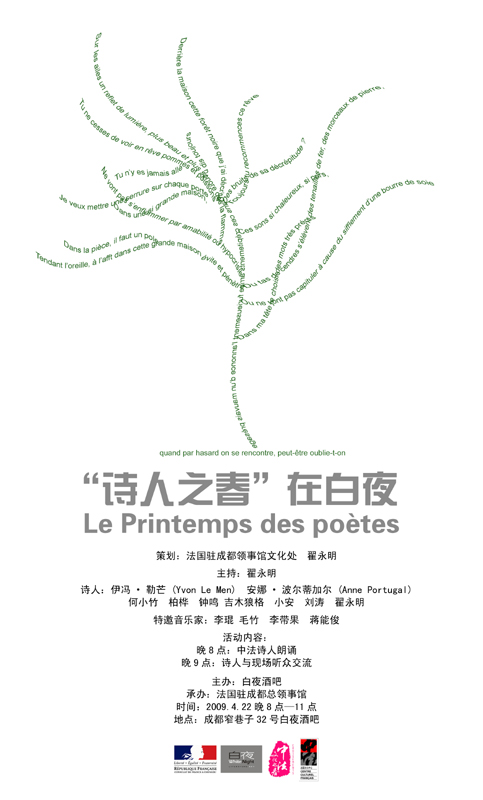 “诗人之春”是中法两国诗人长期进行交流的一个诗歌项目,也是2009年中法文化交流之春的重要活动。在今年四月二十二日,法国大使馆驻成都领事馆将与白夜酒吧共同举办2009年“诗人之春”中法诗人朗诵会。由来自法国的两位诗人和来自成都的七位诗人伊冯·勒芒 安娜·波尔蒂加尔何小竹 柏桦 钟鸣 吉木狼格 小安 刘涛 翟永明,共同朗诵翻译成中法两种语言的诗歌。来自四川音乐学院的音乐家李琨、毛竹和李带果,也将现场表演钢琴及其它乐器组成的即兴音乐。7位成都诗人中的大部分皆来自中国著名的“非非主义”诗歌和“五君子”诗歌流派。届时中法诗人还将与到场的诗歌爱好者交流及回答现场观众的提问,同时,还会有一些与诗歌有关的游戏和联句与之互动。