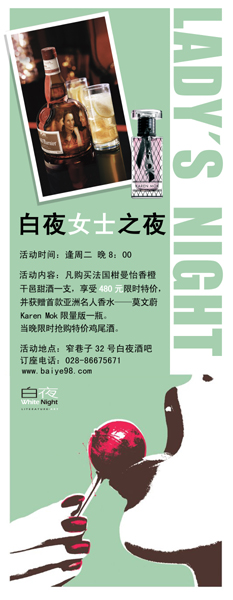 活动内容:凡购买法国柑曼怡香橙干邑甜酒一支,享受480元限时特价,并获赠首款亚洲名人香水——莫文蔚Karen Mok限量版一瓶。当晚限时抢购特价鸡尾酒。