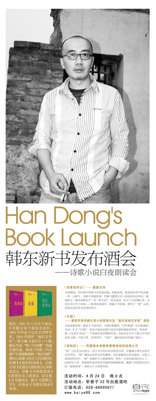 韩东,1961年5月生于南京。8岁随父母下放苏北农村,1982年毕业于山东大学哲学系。1985年组织“他们文学社”,曾主编《他们》1-5期,被认为是“第三代诗歌”的最主要代表,形成了对第三代诗群产生重要影响的“他们诗群”。著有小说集《西天上》《我的柏拉图》《我们的身体》,长篇小说《扎根》《我和你》《英特迈往》,诗集《吉祥的老虎》《爸爸在天上看我》,诗文集《交叉跑动》,散文《爱情力学》,访谈录《毛焰访谈录》等等。