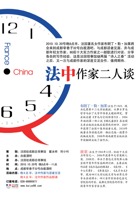 2010.10.20号晚8点半,法国著名女作家布朗丁·勒·加莱将会来到成都窄巷子32号白夜酒吧,与成都读者见面。并与成都年轻女作家、80后十大实力作家之一颜歌进行对谈,分享各自的写作经验。这是法国领事馆继两届“诗人之春”活动之后,又一次与成都作家的深度交流合作。值得期待。