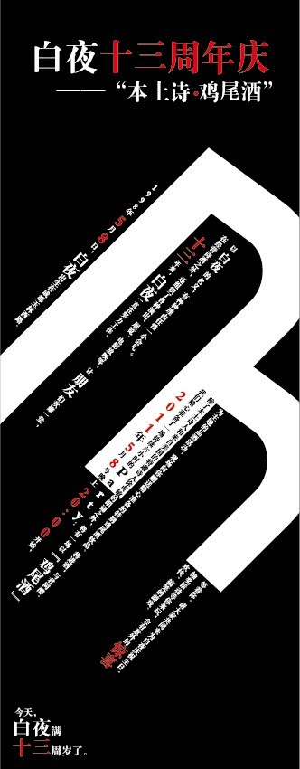1998年5月8日,白夜出生在成都玉林西路。十三年来,白夜一直在努力工作,在经营诗酒之外,还组织了各种演出、展览、电影放映等,让朋友们欢聚一堂,以白夜的名义,有种种理由任性一小会儿。