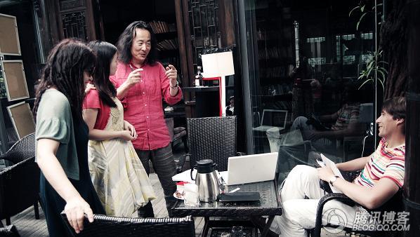 成都本土的竹叶青茶叶赵丽莉送来他们的“飘雪”茶叶,给诗人们做小礼物(左起:翟永明,丽莉,杨炼,ales)