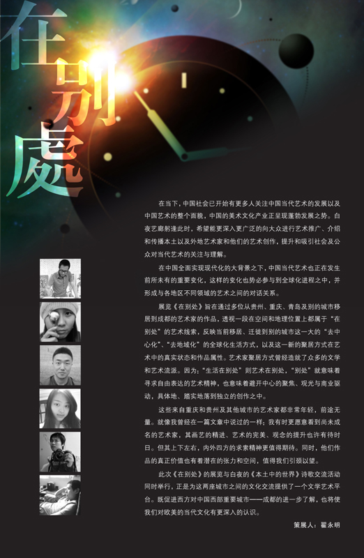 此次《在别处》的展览与白夜的《本土中的世界》诗歌交流活动同时举行,正是为这两座城市之间的文化交流提供了一个文学艺术平台。既促进西方对中国西部重要城市——成都的进一步了解,也将使我们对欧美的当代文化有更深入的认识。