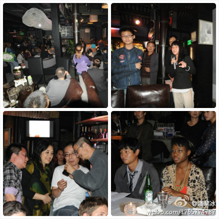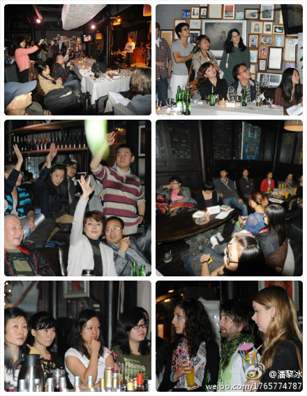 9月26日晚,白夜酒吧;第一天活动:英国当代诗歌单元;活动现场的朋友和读者们。到互动环节,诗歌爱好者的提问很踊跃。有人开玩笑说,提一个问题诗人回答一个问题都同时喝一杯酒。很轻松有趣,缓解了前面严肃的气氛。还有好些人在狂发围脖。