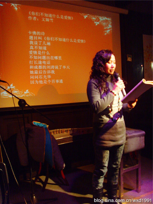 专程从上海飞来成都的女诗人吴斐儿,声情并茂地朗诵了自己的诗作。她感叹道:尽管现实多么不随人意,这么多年,幸好,还有诗歌支撑着自己。