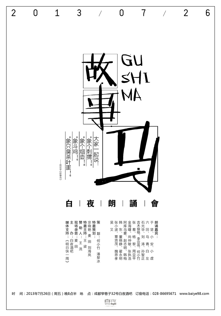 于坚、小安、小虚、六回、乌青、白左、石光华、刘涛、孙智正、吉木狼格、李亚伟、何小竹、张羞、杨黎、周亚平、金海曙、尚仲敏、张执浩、阿库乌雾、赵志明、韩梅、韩东、董晓静、翟永明、张小波、覃贤茂、魏思孝、吴又