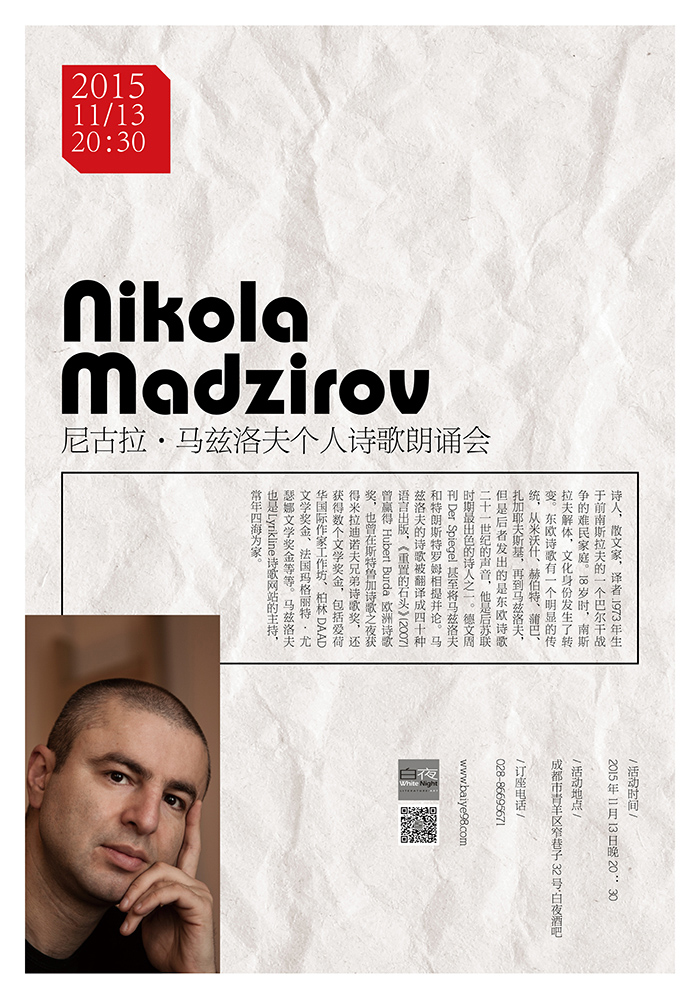 诗人,散文家,译者.1973年生于前南斯拉夫的一个巴尔干战争的难民家庭。18岁时,南斯拉夫解体,文化身份发生了转变。东欧诗歌有一个明显的传统,从米沃什、赫伯特、蒲巴、扎加耶夫斯基,再到马兹洛夫,但是后者发出的是东欧诗歌二十一世纪的声音,他是后苏联时期最出色的诗人之一。德文周刊Der Spiegel 甚至将马兹洛夫和特朗斯特罗姆相提并论。马兹洛夫的诗歌被翻译成四十种语言出版,《重置的石头》(2007) 曾赢得 Hubert Burda 欧洲诗歌奖,也曾在斯特鲁加诗歌之夜获得米拉迪诺夫兄弟诗歌奖,还获得数个文学奖金,包括爱荷华国际作家工作坊、柏林DAAD文学奖金、法国玛格丽特•尤瑟娜文学奖金等等。马兹洛夫也是Lyrikline诗歌网站的主持,常年四海为家。