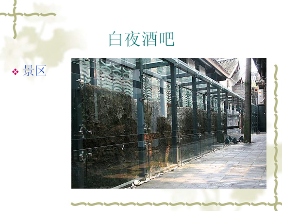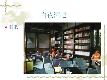 v 白夜酒吧位于成都市窄巷子32号院落(原位于成都市玉林西路85号)。1998年5月8日开业,酒吧主人翟永明是当代文学代表人物之一。白夜融和了酒吧、茶吧和书吧的内容。十年来,聚集着本土、外地,以及国外的大量作家和艺术家。